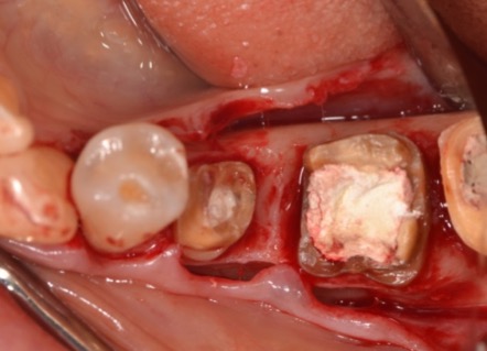歯肉を切って、中をきれいにしていくと、根尖近くまで骨がなくなっていることが分かります。