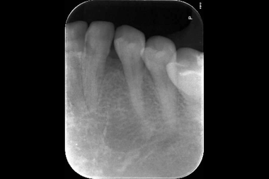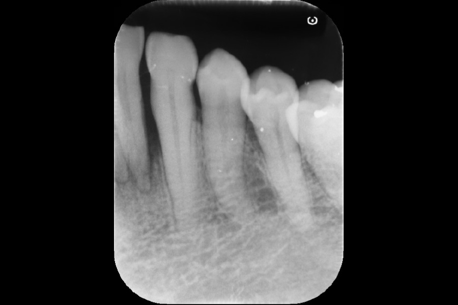 - 右下4遠心に垂直性骨吸収が認められたためエムドゲインと骨補填材を用いて歯周組織再生療法を行った