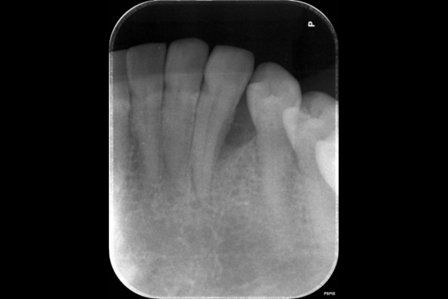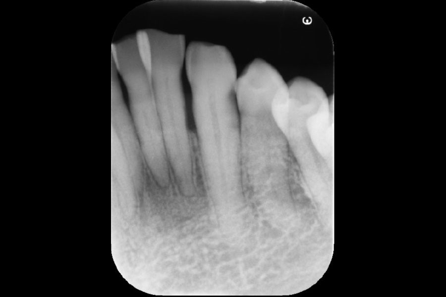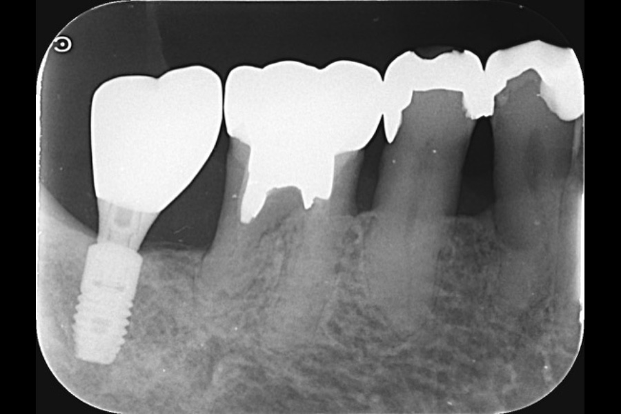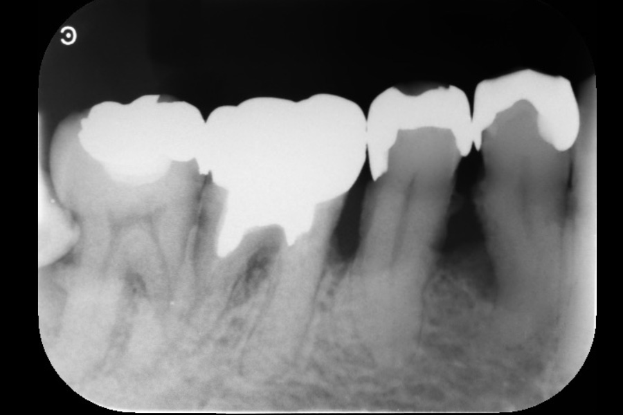 - 左下3遠心に垂直性骨吸収が認められたためエムドゲインと骨補填材を用いて歯周組織再生療法を行った