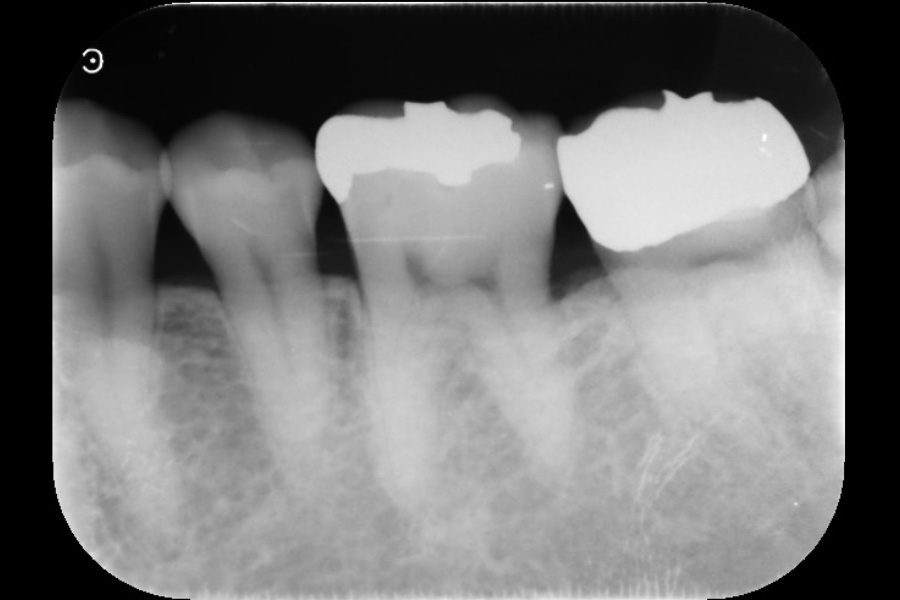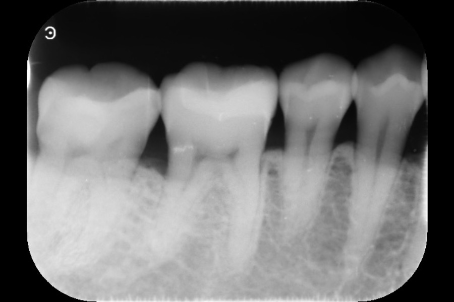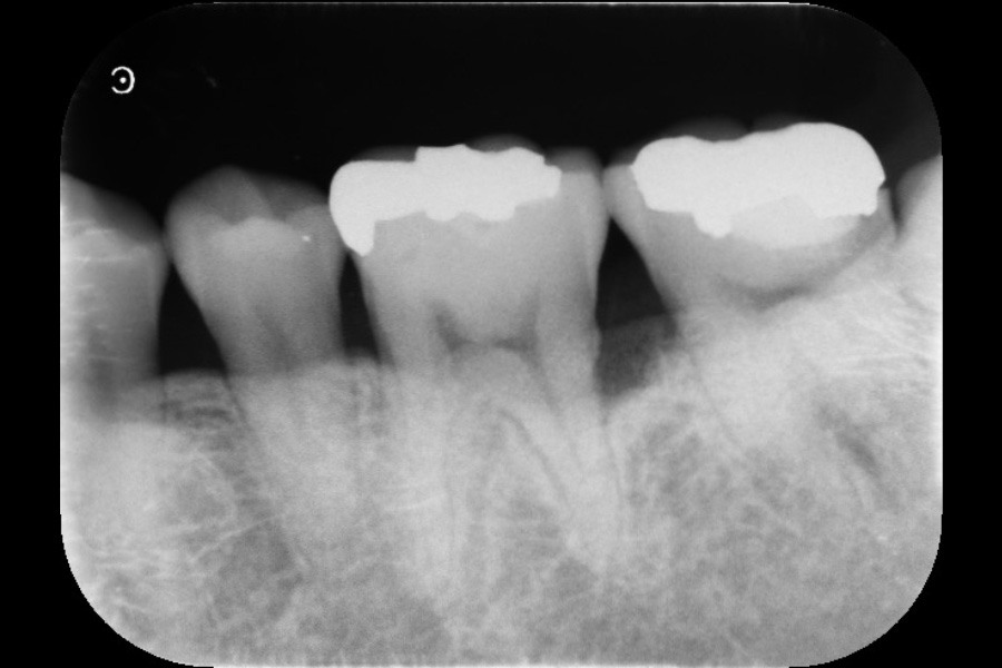 - 左下2遠心に垂直性骨吸収が認められたためエムドゲインと骨補填材を用いて歯周組織再生療法を行った