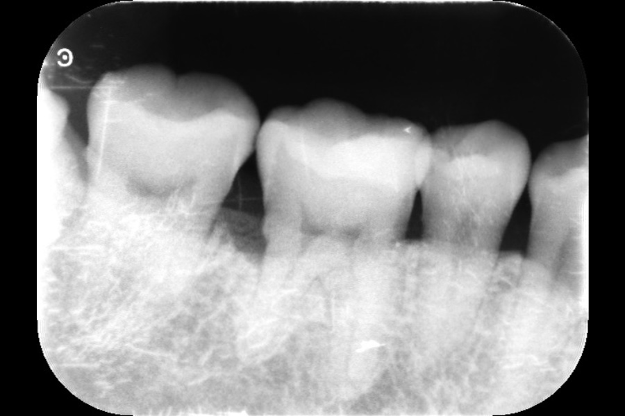 - 右下6遠心に垂直性骨吸収が認められたためエムドゲインと骨補填材を用いて歯周組織再生療法を行った