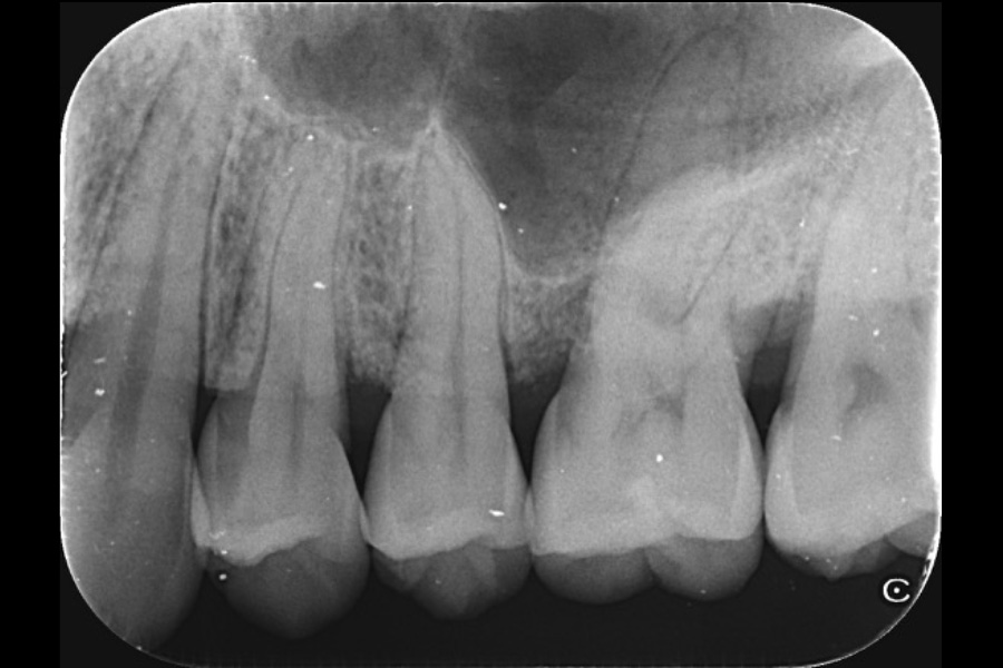 - 左上3近心に垂直性骨吸収が認められたためエムドゲインと骨補填材を用いて歯周組織再生療法を行った