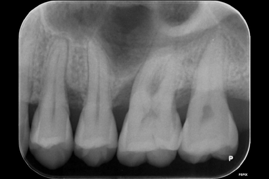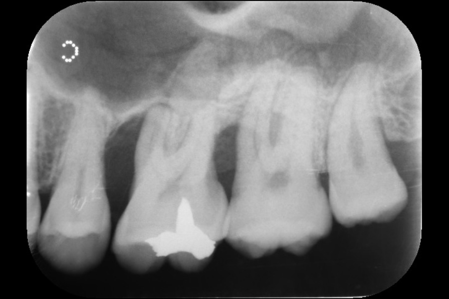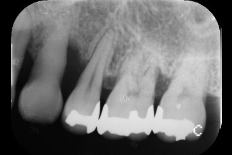 - 左上4遠心と左上6近心に垂直性骨吸収が認められたためエムドゲインと骨補填材を用いて歯周組織再生療法を行った