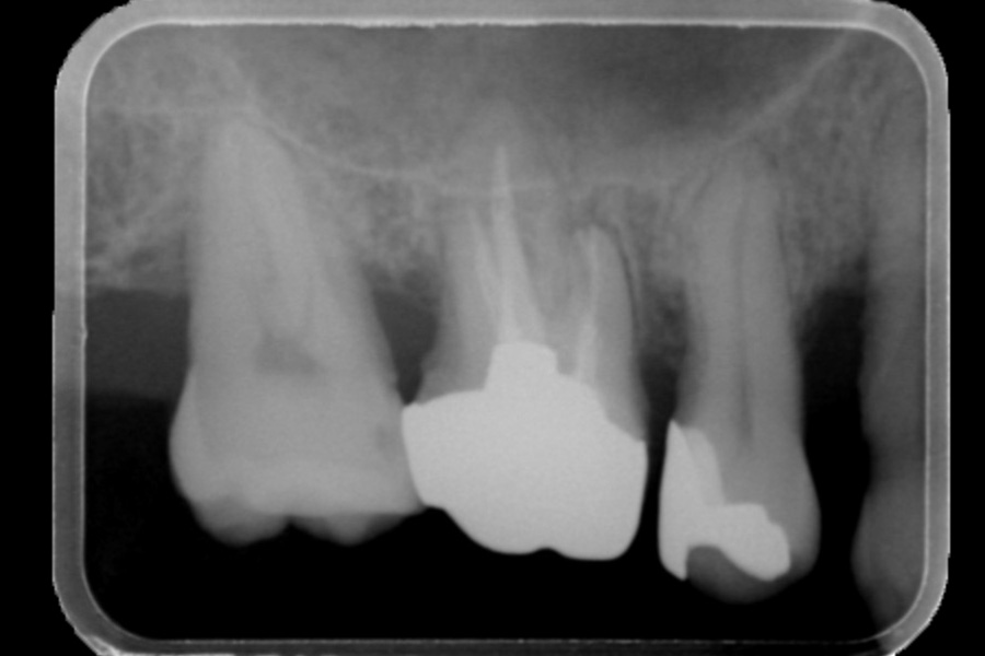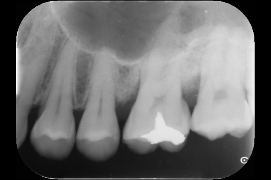 - 左上6近遠心に垂直性骨吸収が認められたためエムドゲインと骨補填材を用いて歯周組織再生療法を行った