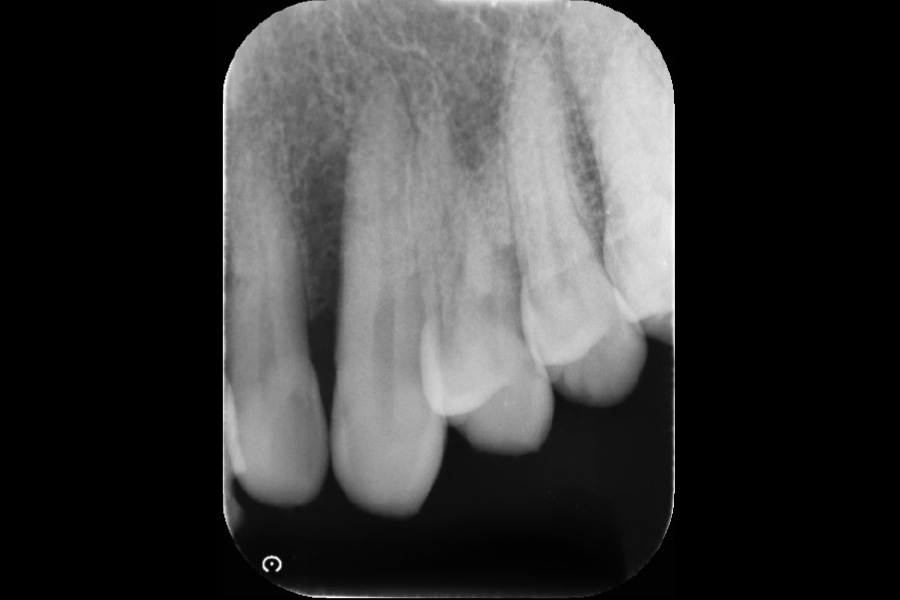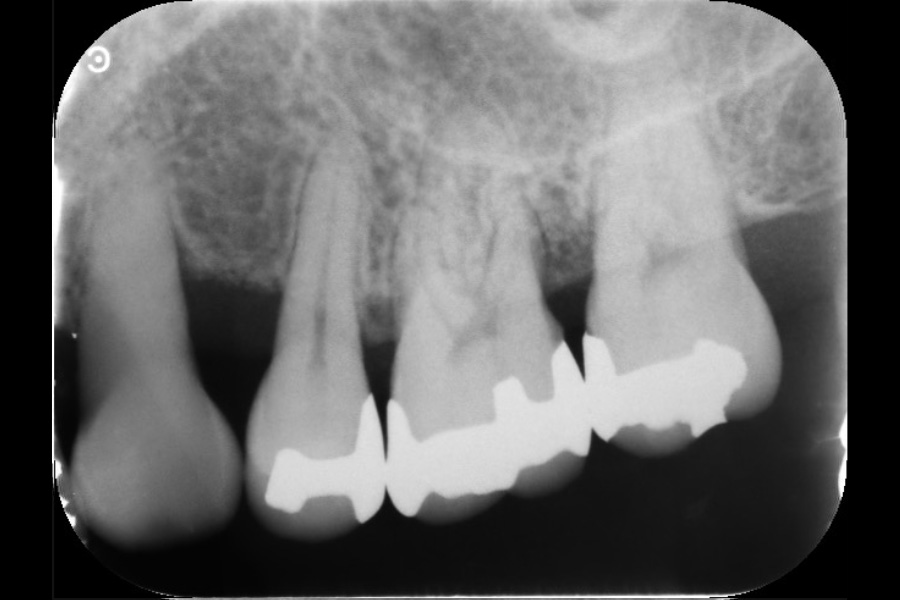 - 右上3遠心に垂直性骨吸収が認められたためエムドゲインと骨補填材を用いて歯周組織再生療法を行った