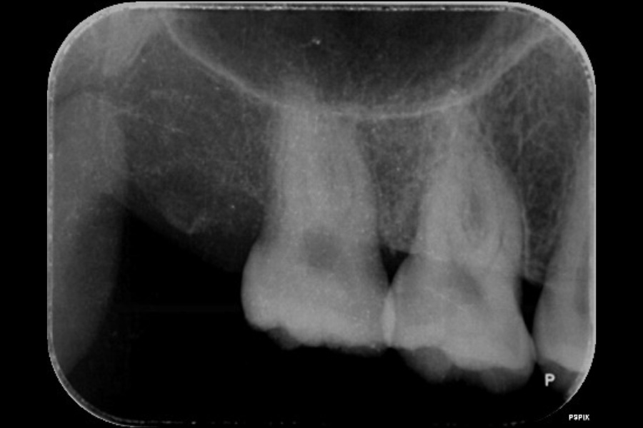 - 右上6遠心に垂直性骨吸収が認められたためエムドゲインと骨補填材を用いて歯周組織再生療法を行った