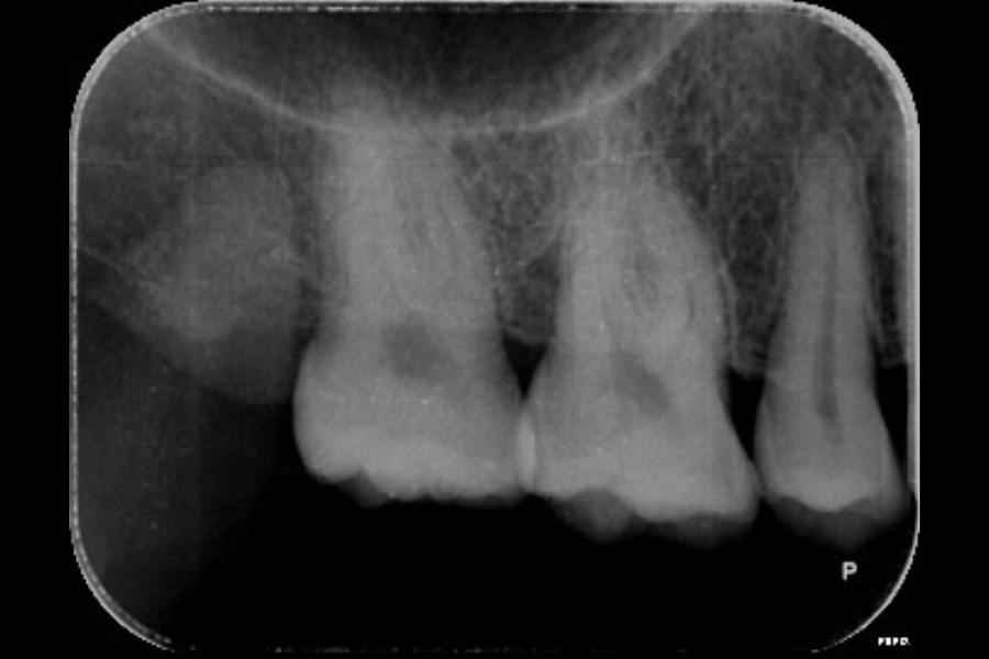 - 左上3遠心に垂直性骨吸収が認められたためエムドゲインと骨補填材を用いて歯周組織再生療法を行った