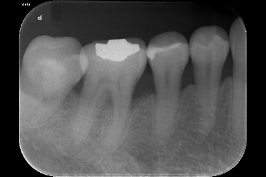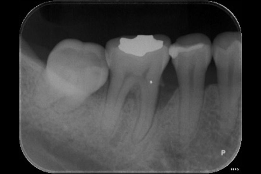 - 右下6近心に垂直性骨吸収が認められたためエムドゲインと骨補填材を用いて歯周組織再生療法を行った