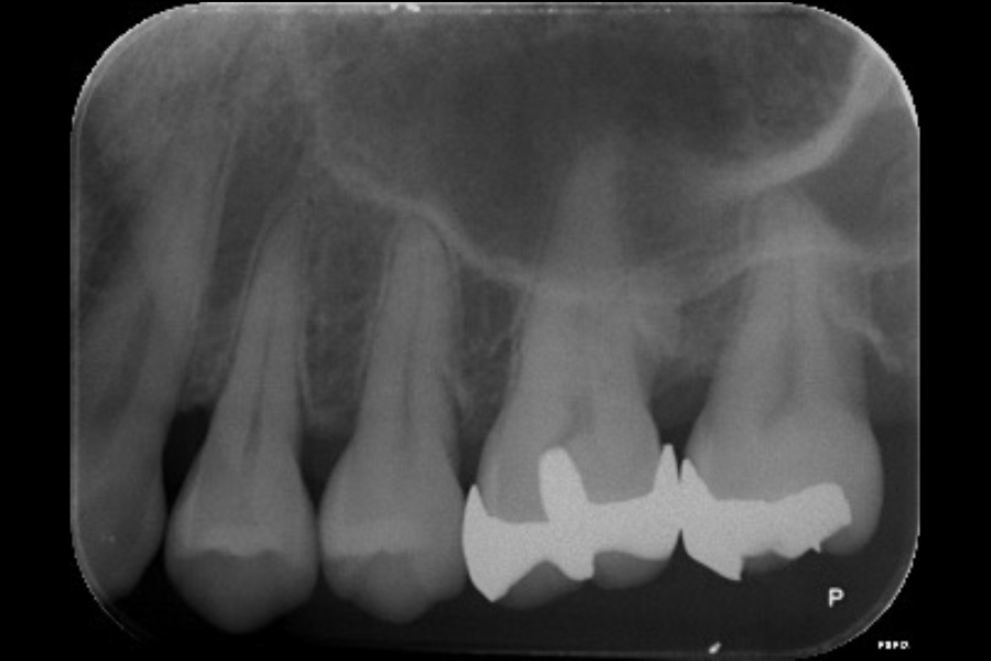- 左上6近遠心に垂直性骨吸収が認められたためエムドゲインと骨補填材を用いて歯周組織再生療法を行った