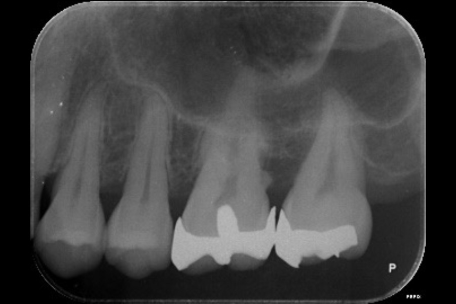 - 左上4遠心と左上6近心に垂直性骨吸収が認められたためエムドゲインと骨補填材を用いて歯周組織再生療法を行った